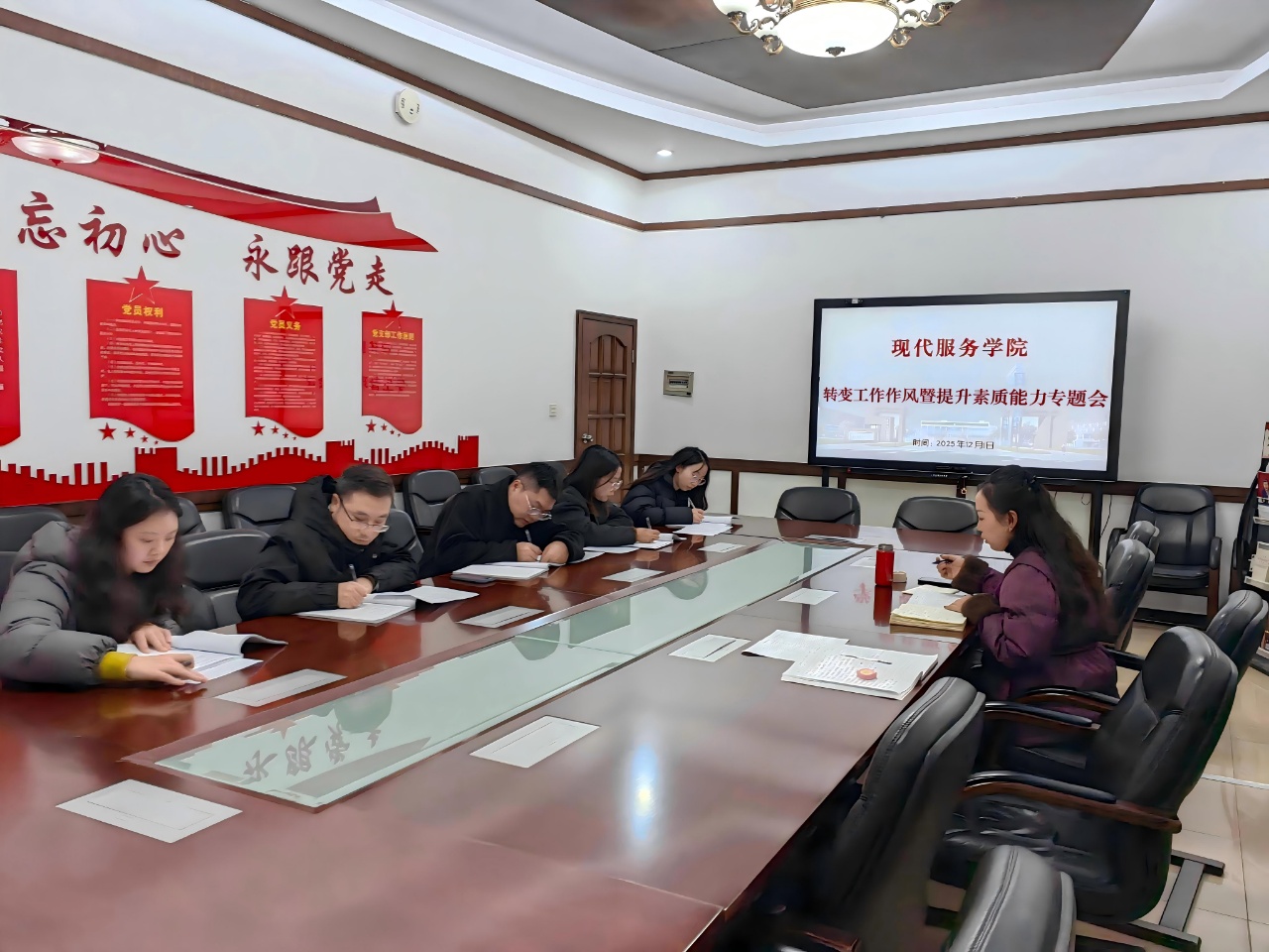为深入贯彻《全面加强新时代高校辅导员队伍建设行动方案》《高等学校辅导员职业能力标准(暂行)》《教育强国建设规划纲要(2024—2035年)》等国家政策要求,进一步强化思想政治教育工作队伍的建设,深化作风改进,全面提升学工人员综合素质与工作效能,2025年12月1日上午9点,现代服务学院学生工作办公室组织召开关于思想政治教育工作队伍转变工作作风暨提升素质能力专题工作会议。会议由学工办主任邱华倩主持并领学,学工干事及全体辅导员参会。