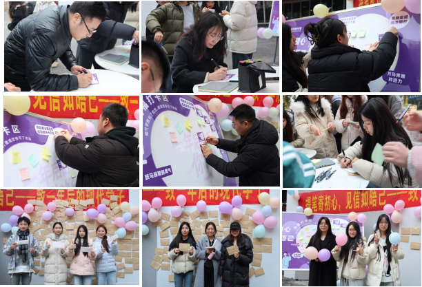 习近平总书记“锐始者必图其终,成功者先计于始”的寄语清晰标注其上,为青春之约注入奋进力量;信纸、多彩便利贴与彩色笔整齐陈列,志愿者有序引导,满怀期待的学子们纷纷驻足参与。大家热情高涨,或伏案梳理学业、技能等成长期许落于信笺,或提笔在便利贴写下自我鼓劲的字句,辅导员们也融入其中,为学子们送上新一年的真挚祝福,一张张承载憧憬与关怀的便签很快将展板“一年后的自己,你好”区域层层铺满,化作色彩斑斓的“青春寄语墙”,现场热烈有序,尽显学子积极风貌与师生同心温情。那些认真书写的侧脸、张贴便签时的微笑、合影时的真挚,都成为学院里最动人的风景。