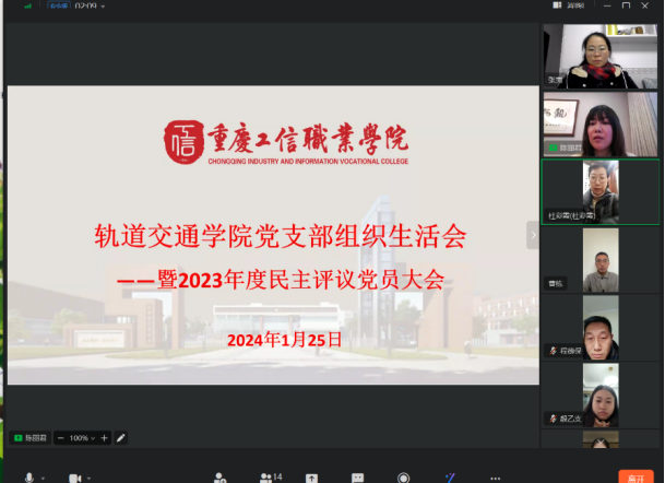 民主评议党员制度是加强党的建设的重要制度。根据校党委关于《召开2023年度基层党组织组织生活会和开展民主评议党员的通知》的要求。轨道交通学院党支部2023年度民主评议工作及组织生活会于2024年01月25日下午3:00以线上的方式召开,支部书记杜彩霞主持会议。支部现有党员15名,全部参加了民主评议。