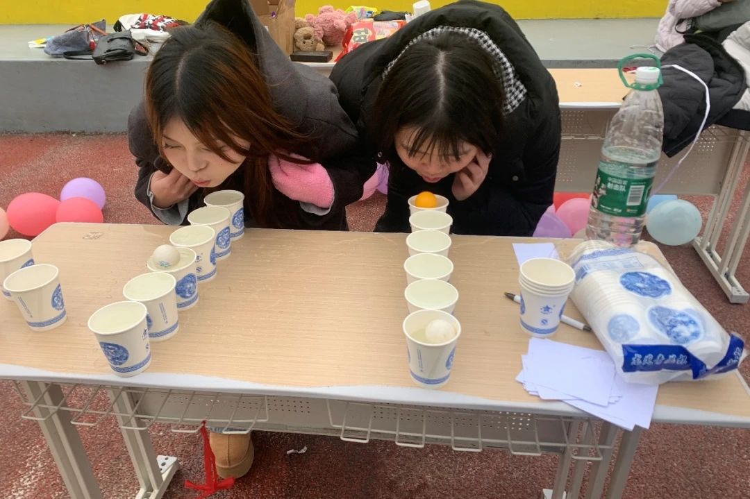 队伍分成两组,每组各派一位成员先行上场,将每组成员前面的杯子里面依次加满水,然后放入乒乓球,然后把乒乓球从第一个杯子依次吹到最后一个杯子,一分钟倒计时,先吹到最后一个杯子里的成员获胜,这是一场策略和肺活量的较量,让我们共同见证奇迹的诞生。