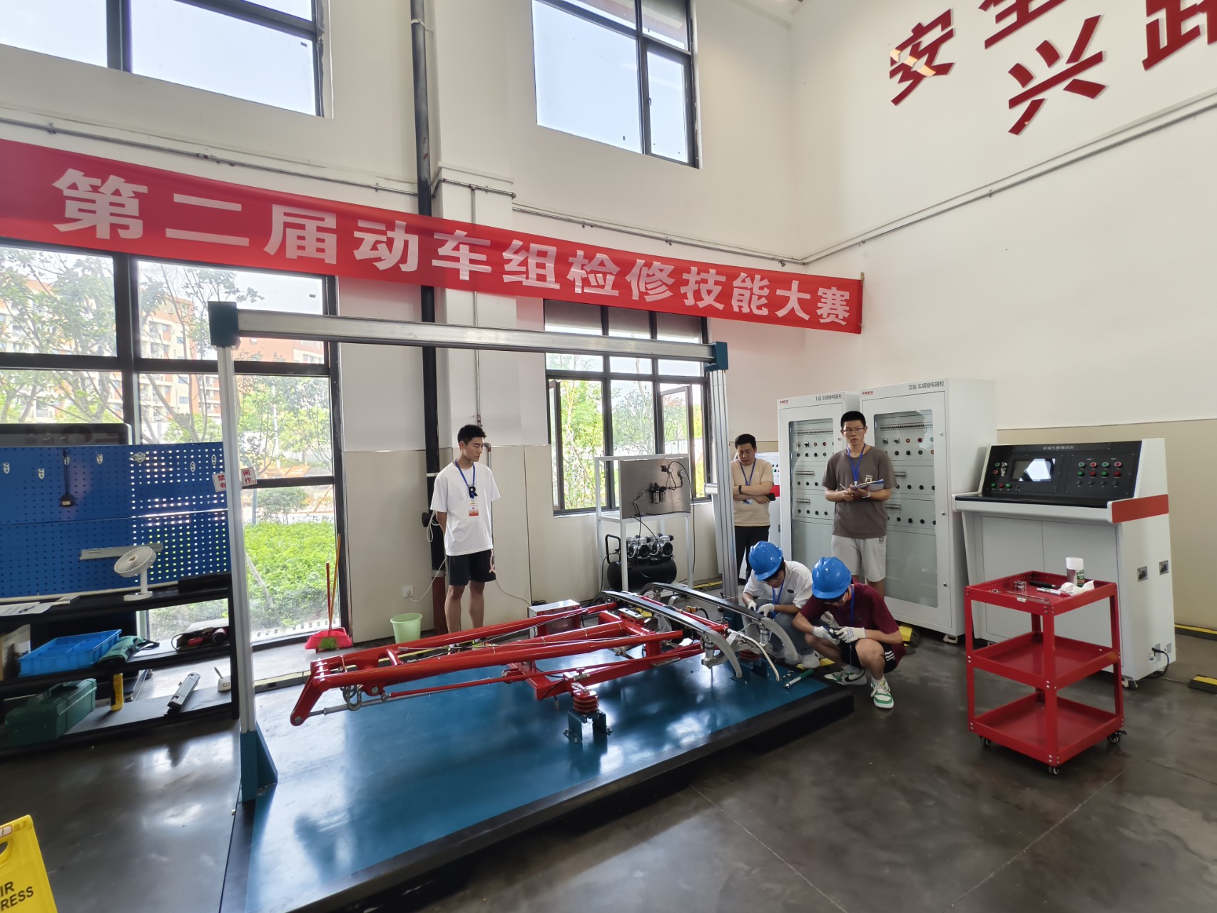 在国家深化职业教育改革、推进"技能中国行动"的背景下,轨道交通学院于2025年5月21日在动车组机械检修实训室3105成功举办第二届动车组检修技能大赛。作为职教活动周的重点项目,本次大赛以"精技强能 匠心筑梦"为主题,吸引了动车组检修技术专业的52名学生参与,通过"理论+实操"的双维度考核,全面检验学生的职业素养与专业技能。