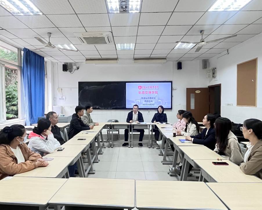 2025年10月24日中午,轨道交通学院铁道运营教研室在渝中校区1208教室组织开展第七周教研活动。活动由教研室主任赵文臣主持,教研室全体教师参会,轨道交通学院院长黄兰华莅临指导,围绕教学管理优化、课程建设深化、人才培养质量提升等核心议题展开深入研讨。