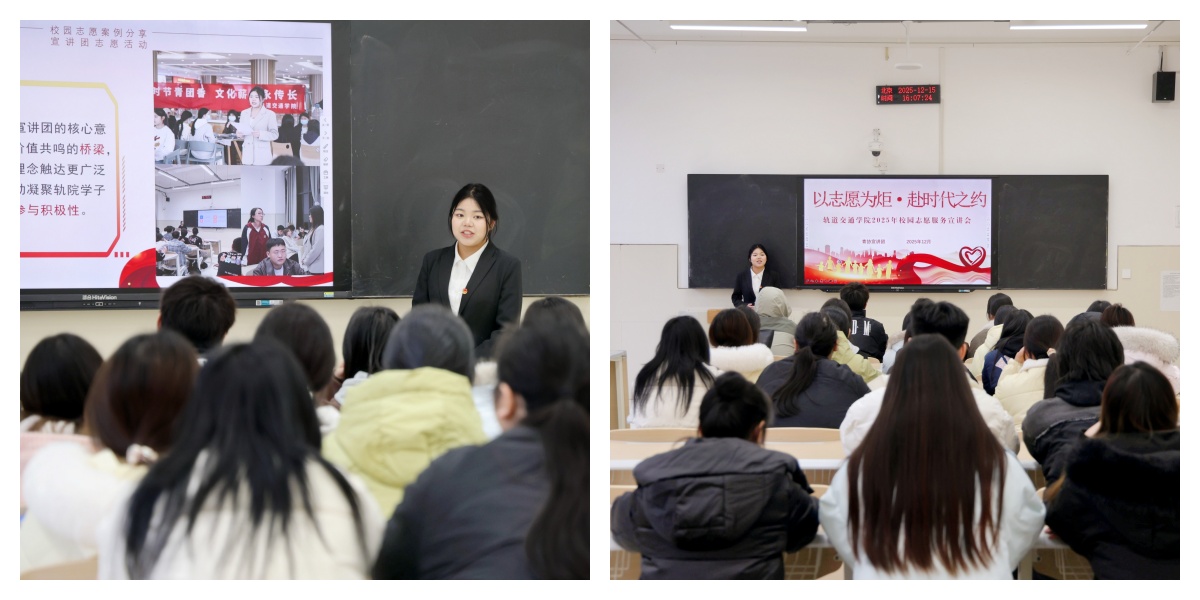 与此同时,学院青年志愿者协会统筹开展了“国际志愿者日”主题宣讲活动。12月15日至24日期间,共举办11场宣讲,覆盖多个班级与团支部。主讲人系统回顾了国际志愿者日的发展历程——1985年,联合国大会通过决议,将每年12月5日确立为“国际促进经济和社会发展志愿人员日”;自1986年起,这一节日成为全球表彰志愿贡献、弘扬人道精神、倡导公益参与的重要契机。宣讲还结合图书馆秩序维护、关爱留守儿童、交通引导等校园志愿服务真实案例,生动诠释志愿精神的时代内涵,将抽象理念转化为可感可知的青春故事,有效激发了同学们投身公益的内生动力与行动自觉。