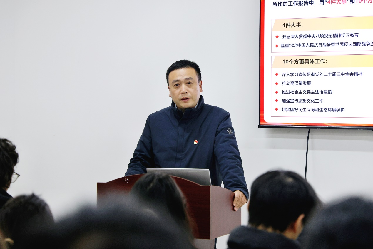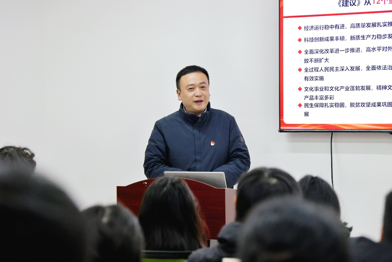 为深入学习贯彻党的二十届四中全会精神,2026年1月4日,轨道交通学院党总支书记马毅为学院辅导员、学生代表开展了一场别开生面的专题宣讲会。会上,马书记围绕全会提出的“十五五”时期经济社会发展目标任务,部署贯彻落实举措,并号召同学们认真学习,技能报国。