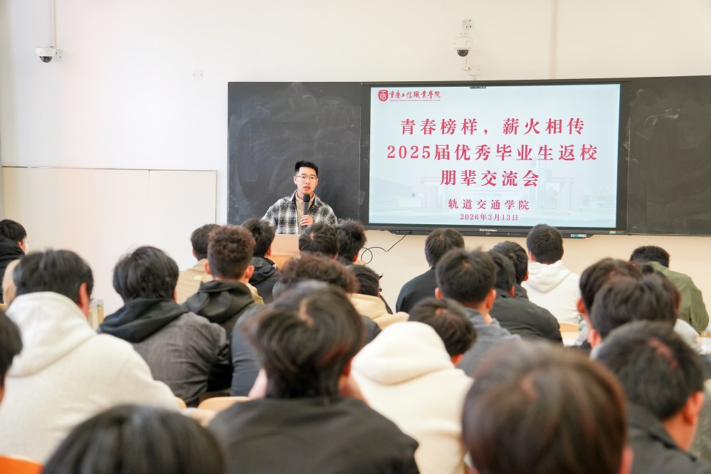 为充分发挥优秀毕业生的榜样引领作用,帮助在校生明晰职业规划、树立就业信心,3月13日上午,轨道交通学院在长寿校区立德楼1207教室举办“青春榜样,薪火相传”2025届优秀毕业生返校朋辈交流会。学院2022级动车组检修技术专业优秀毕业生、现就职于成都铁路局重庆西车辆段的陈俊松受邀回校,为2024级学子带来了一场干货满满、温情脉脉的成长分享会。学院相关辅导员及2024级学生代表参加了本次活动。