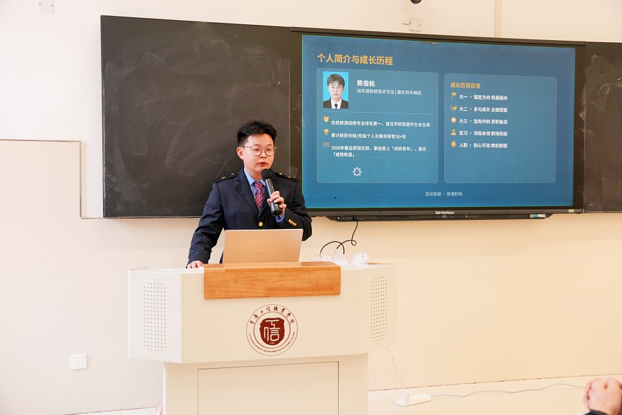 “在校期间的每一次技能训练、每一场竞赛磨砺,都是通往职场的坚实阶梯。”陈俊松重点讲述了自己在春运一线的工作见闻。面对高强度的工作负荷和严苛的技术标准,他凭借在校期间打下的扎实功底,迅速成长为业务骨干。2026年春运期间,他因表现优异,先进事迹被“成铁青年”公众号专题报道,并获提名参评集团公司级先进青年“成铁新星”。他用生动的案例告诉学弟学妹们:只有将个人理想融入交通强国战略,在平凡岗位上精益求精,才能书写不平凡的青春答卷。