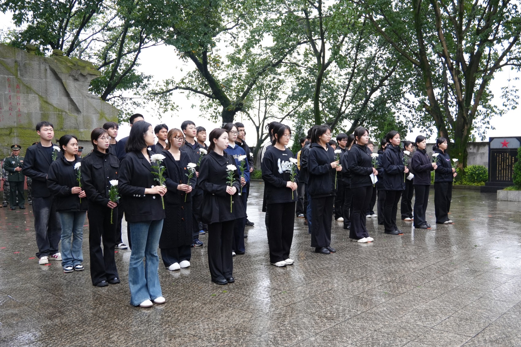 上午9时,师生们准时在学院集合,统一乘车前往祭奠地点。抵达陵园后,全体师生在纪念碑前整齐列队,现场气氛庄严肃穆。