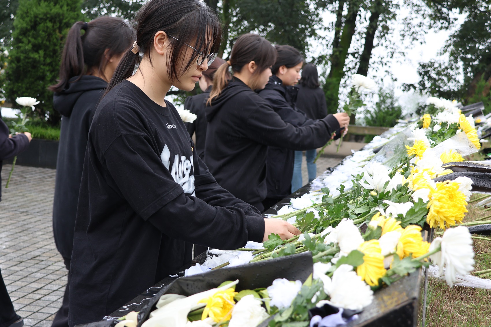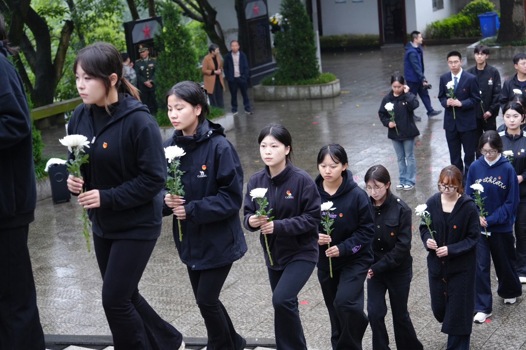 活动的最后,全体师生手持白菊,以有序列队的方式向先烈纪念碑、英烈墙敬献鲜花。