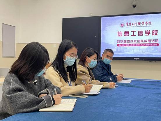 教研活动第二阶段,结合重庆市第六届职业院校传媒艺术作品大赛校内作品收集情况,信息工程学院负责人彭阳就学生作品与专业课老师进行研讨交流,并完成了作品的初步筛选。
