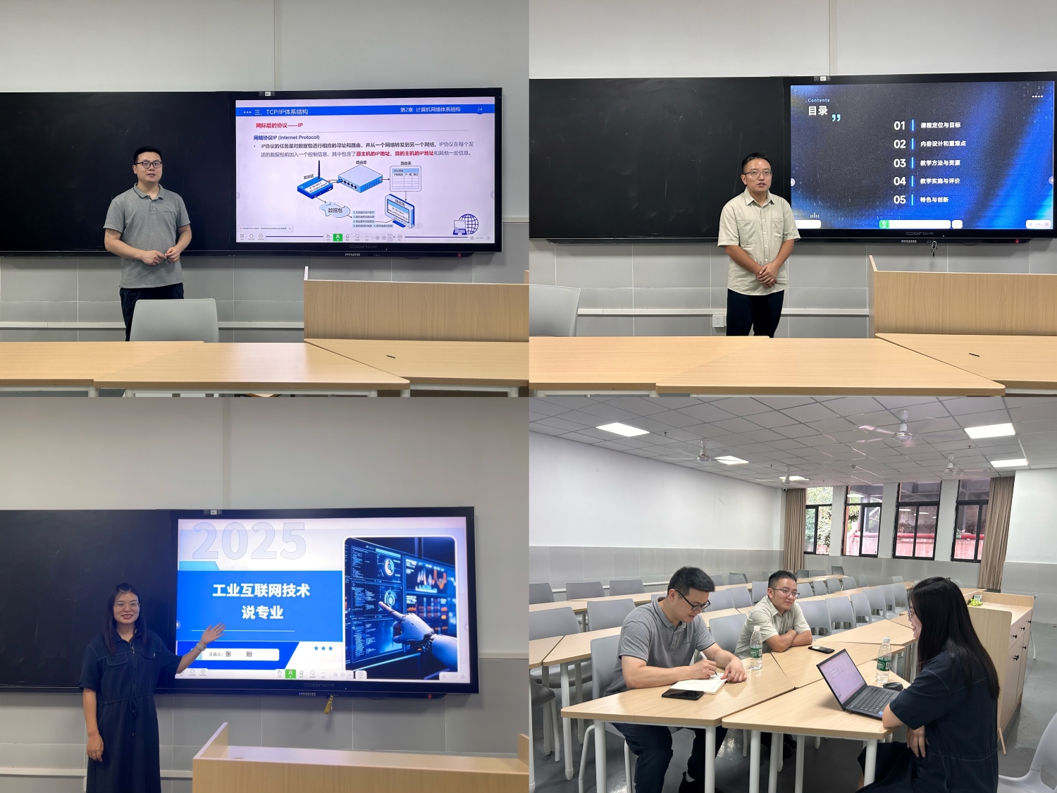 教研室主任张盼以工业互联网技术专业人才培养目标、课程体系架构、特色与创新及就业方向为核心,进行“说专业”分享,明确专业建设重点;李姜伟老师以《数据库基础》课程为例,从课程定位、教学目标、重难点把握、教学方法创新及评价机制等角度展开“说课程”分享;张浩老师则通过《网络与通信技术基础》的课堂片断展示,生动呈现了互动教学方法与课堂组织策略。