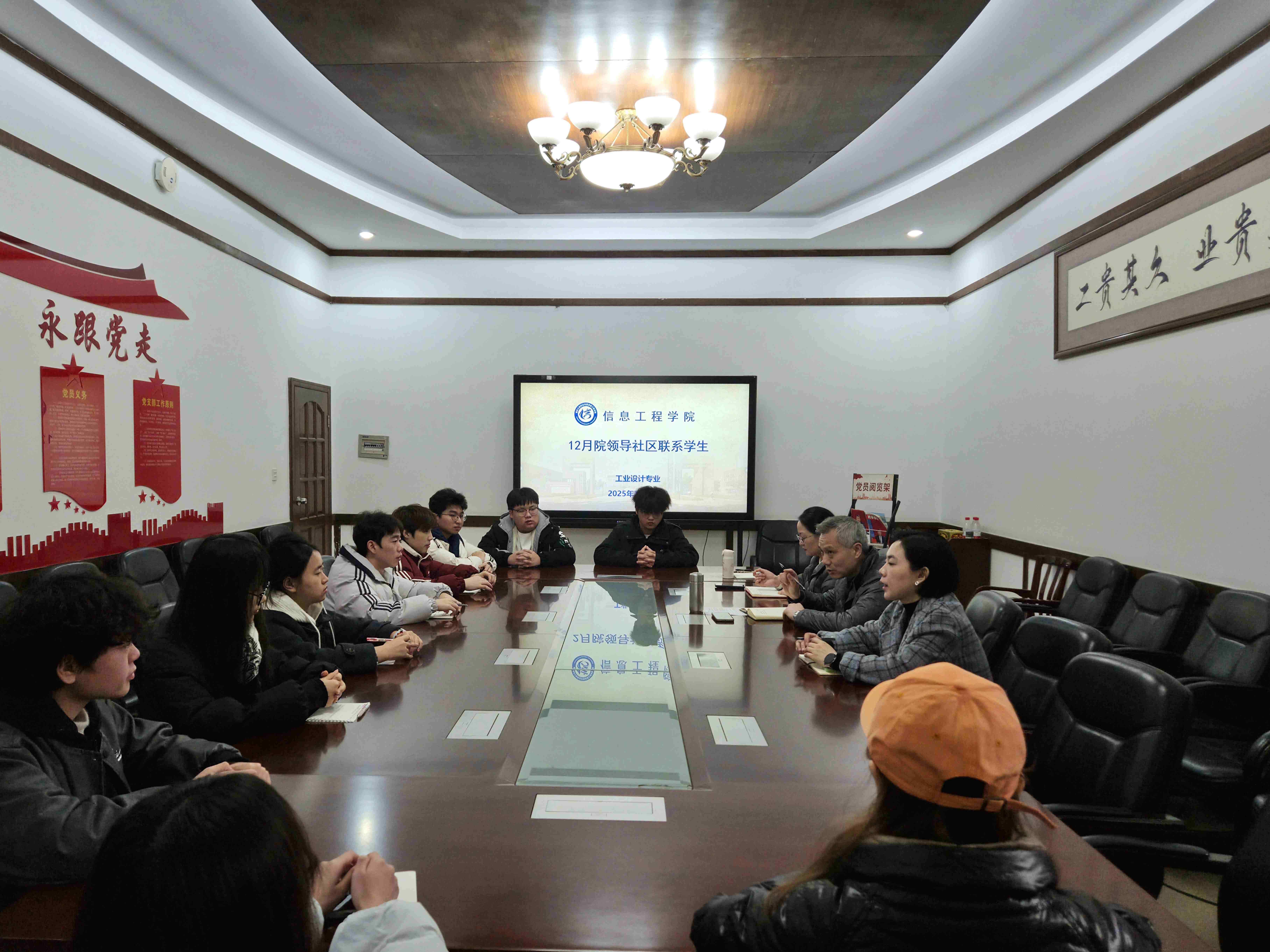 为进一步加强师生联系,畅通学生意见反馈渠道,切实解决学生在学习、生活、就业等方面遇到的实际问题,2025年12月16日,信息工程学院在3315会议室成功举办“12月院领导社区联系学生活动”。学院党总支书记左磊、学工办干事兼团总支书记赵钦蕊、工业设计教研室主任周婷,与来自工业设计专业24级、25级的10名学生代表展开面对面座谈,围绕学业发展、实习就业、校园生活等问题进行了深入交流。