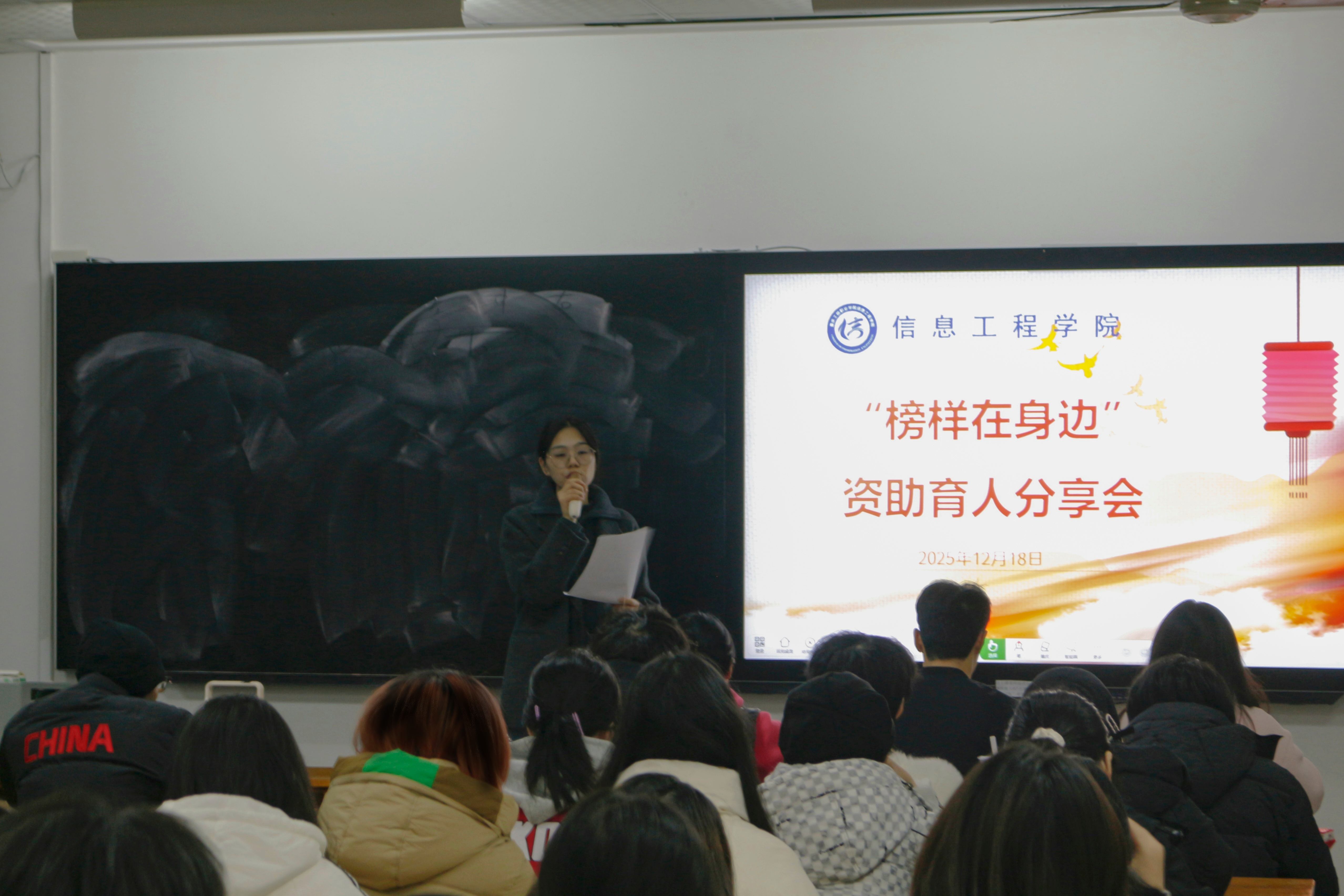 为深入贯彻落实国家资助育人政策,发挥优秀受资助学生的示范引领作用,营造“自强不息、励志成才、感恩奉献、追求卓越”的校园氛围,信息工程学院于2025年12月18日晚19:00在世纪楼402教室成功举办“榜样在身边”资助育人分享会。活动通过优秀受资助学生代表的亲身讲述,展现他们在国家资助政策的支持下克服困难、奋发学习、全面成长的励志故事,传递积极向上的青春能量。
