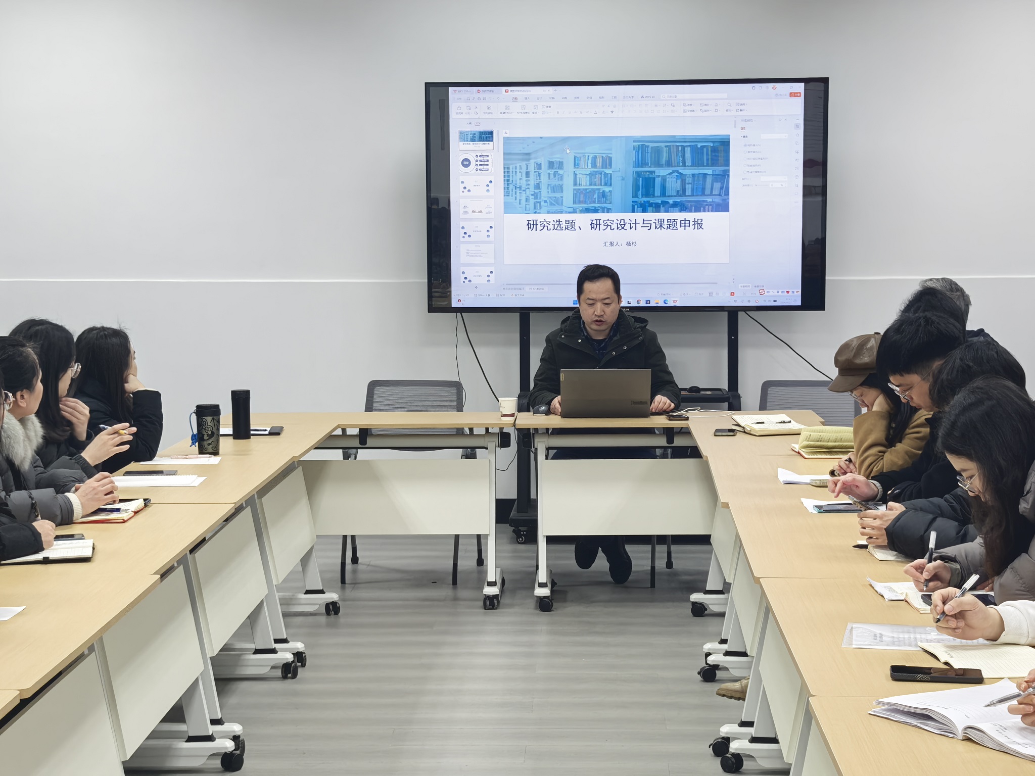 讲座中,杨杉围绕“课题研究选题、研究设计与课题申报”核心主题,从四大维度展开系统讲解。他首先结合高校职称评审政策,深入剖析了科研成果在职称晋升中的关键作用,强调了课题研究与学术产出对青年教师职业发展的重要意义。随后,他详细梳理了各类项目申报的时间节点与论文征文比赛的关键周期,为教师们规划科研工作提供了清晰指引。
