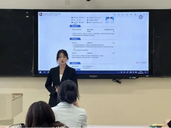活动现场,教室化身为“招聘会场”,同学们按照顺序依次走上讲台,通过投屏展示精心制作的简历,展开3分钟的精彩自我介绍。大家自信满满地阐述自己的专业技能、实践经历与职业规划,充分展现出药品质量236班学子昂扬向上的精神风貌。当一位同学在自我介绍中提到参与过药品质量检测实验项目时,禹盼老师立刻追问:“检测过程中,仪器突然出现数据异常,而项目交付时间紧迫,你会如何快速解决?”同学思考后回答将先检查仪器基础参数、重启设备,若不行就启用备用仪器。禹盼老师肯定其思路的同时,提醒其可以及时与团队成员分工协作,高效排查问题。