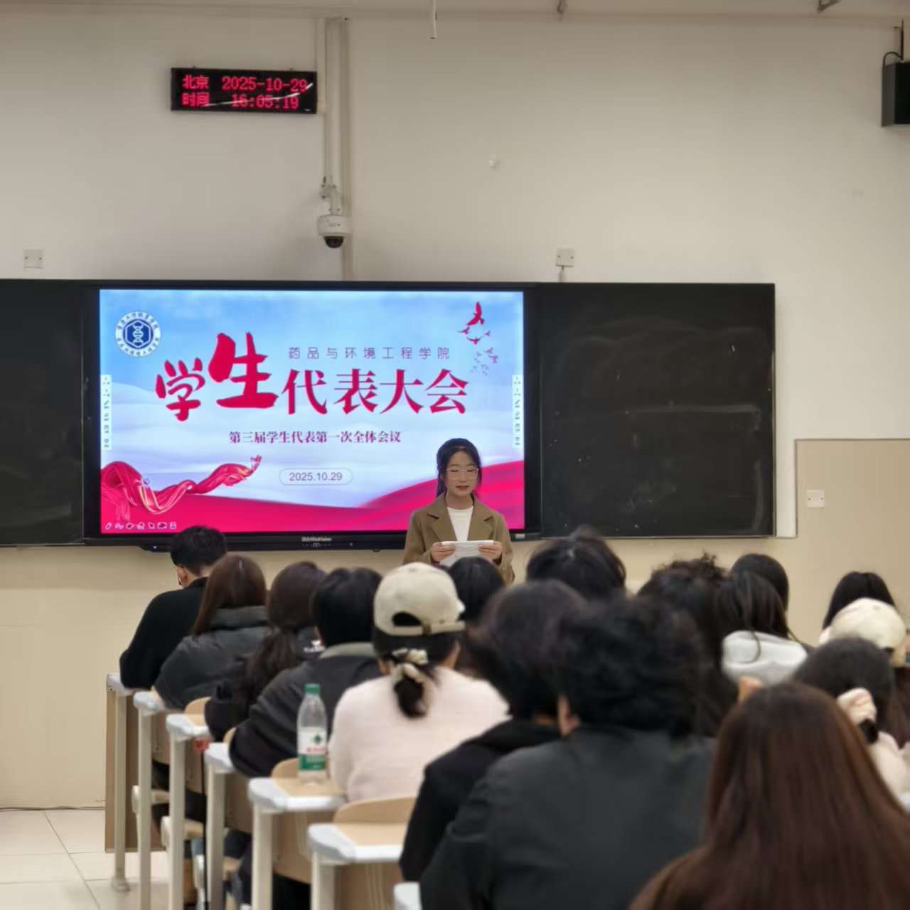 2025年10月29日,药品与环境工程学院第三次学生代表大会在庄严的国歌声中隆重开幕。学工干事杨柳老师、辅导员龙小爽老师出席会议,与来自全院各年级各专业的学生代表共同参加了本次大会。