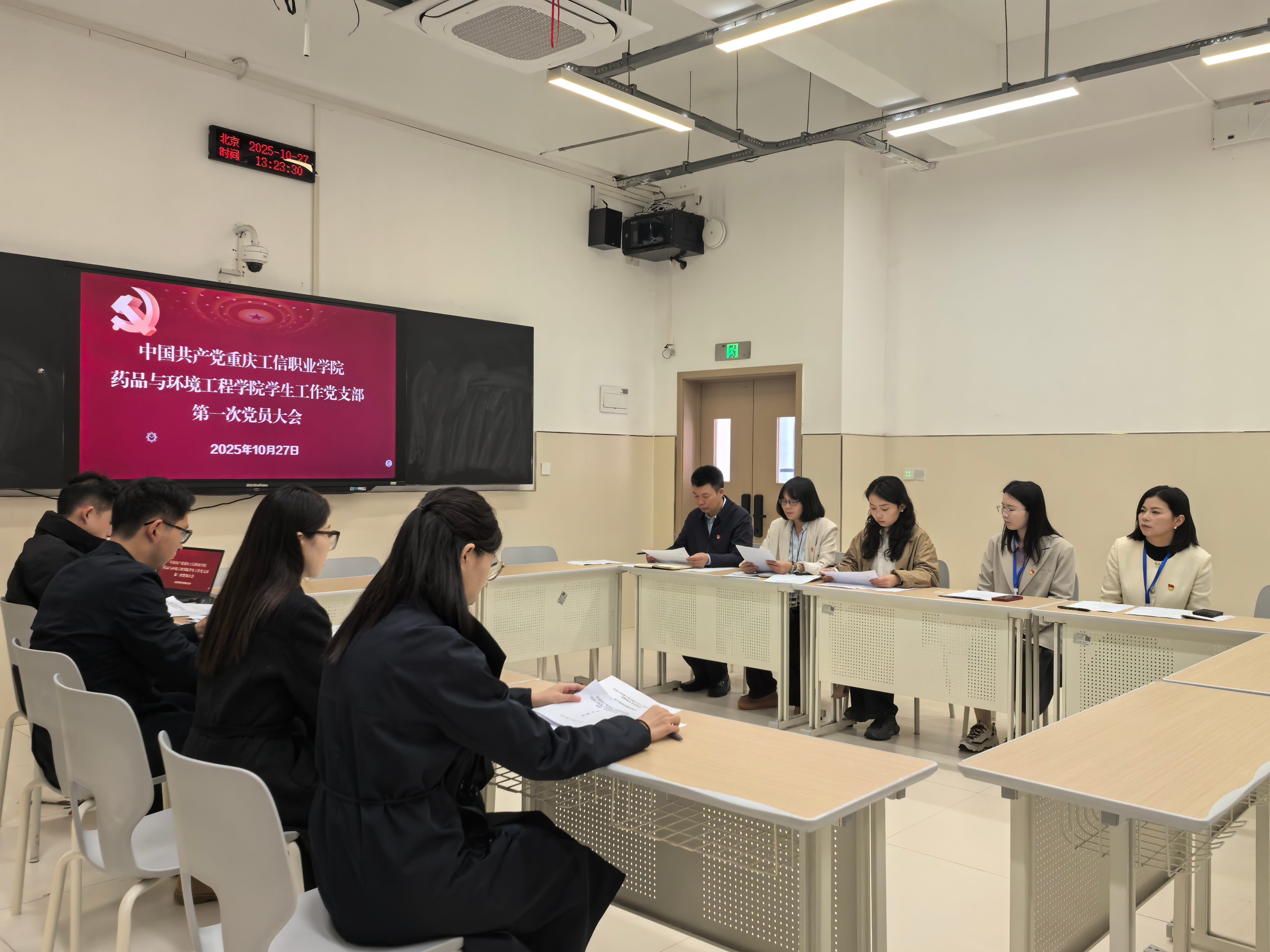 2025年10月27日,中共重庆工信职业学院药品与环境工程学院学生工作党支部第一次党员大会在重庆工信职业学院(长寿校区)2309会议室隆重举行,大会在庄严的国歌声中开幕。药品与环境工程学院党总支书记欧永春和学生工作党支部全体党员一起参加大会。