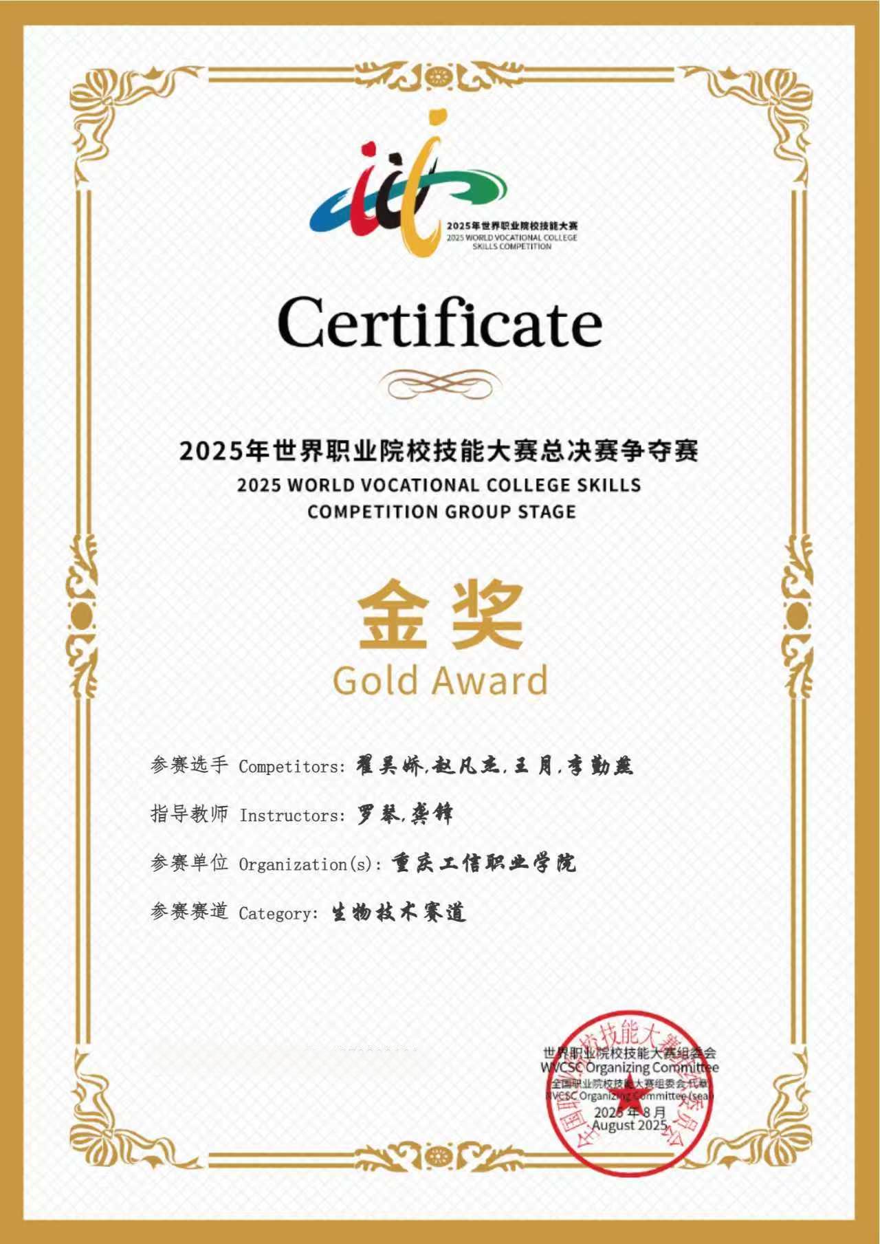2025年8月29日, 2025年世界职业院校技能大赛总决赛争夺赛“生物技术”赛道圆满落幕。经过激烈角逐,药品与环境工程学院参赛选手翟吴娇、赵凡杰、王月、李勤燕,在指导老师龚锋、罗琴、陈浪、何慧慧、何小新等的悉心指导下,凭借精湛专业技艺与出色的综合能力,成功斩获生物技术赛道金奖。