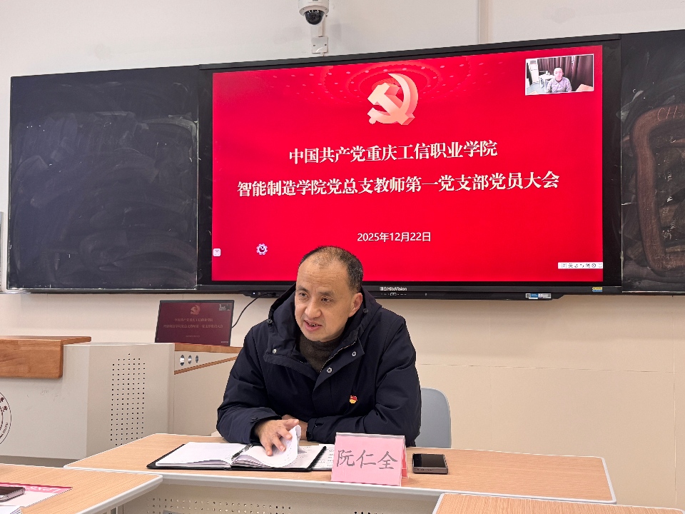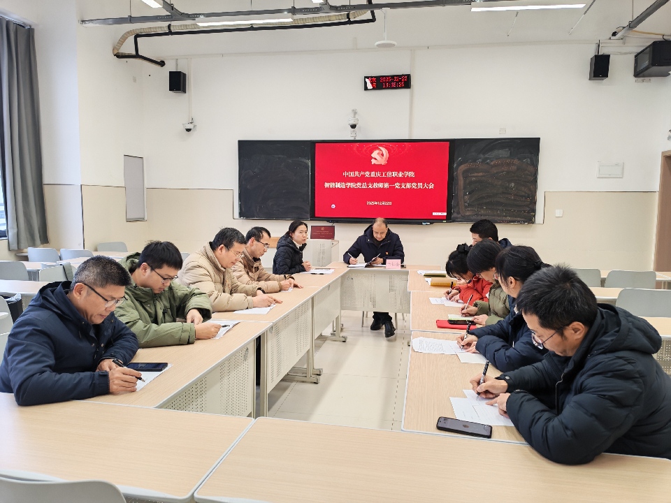 为深入学习贯彻党的二十届四中全会精神,切实统一思想行动,2025年12月22日,重庆工信职业学院智能制造学院教师第一党支部在长寿校区立德楼1403召开专题党员大会。会议由党支部书记周丁霖主持,全体党员参会,学校党委委员、副院长阮仁全出席并发表讲话。