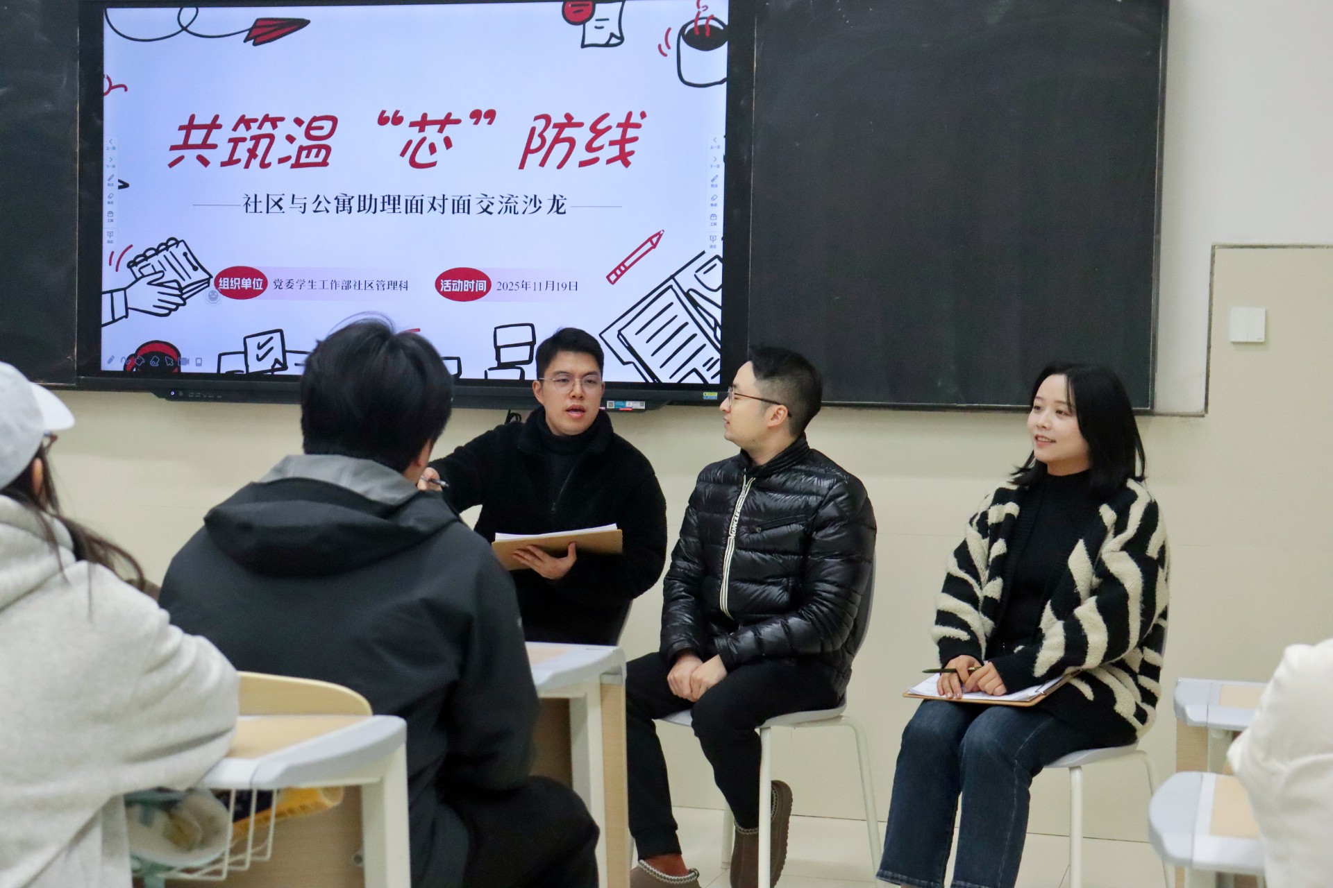 2025年11月19日19:00,重庆工信职业学院“共筑温‘芯’防线”公寓助理面对面交流沙龙在广知楼2104教室温馨开启。“一站式”学生社区老师们与全体公寓助理齐聚一堂,开启了一场知识与温暖并存的交流之旅。