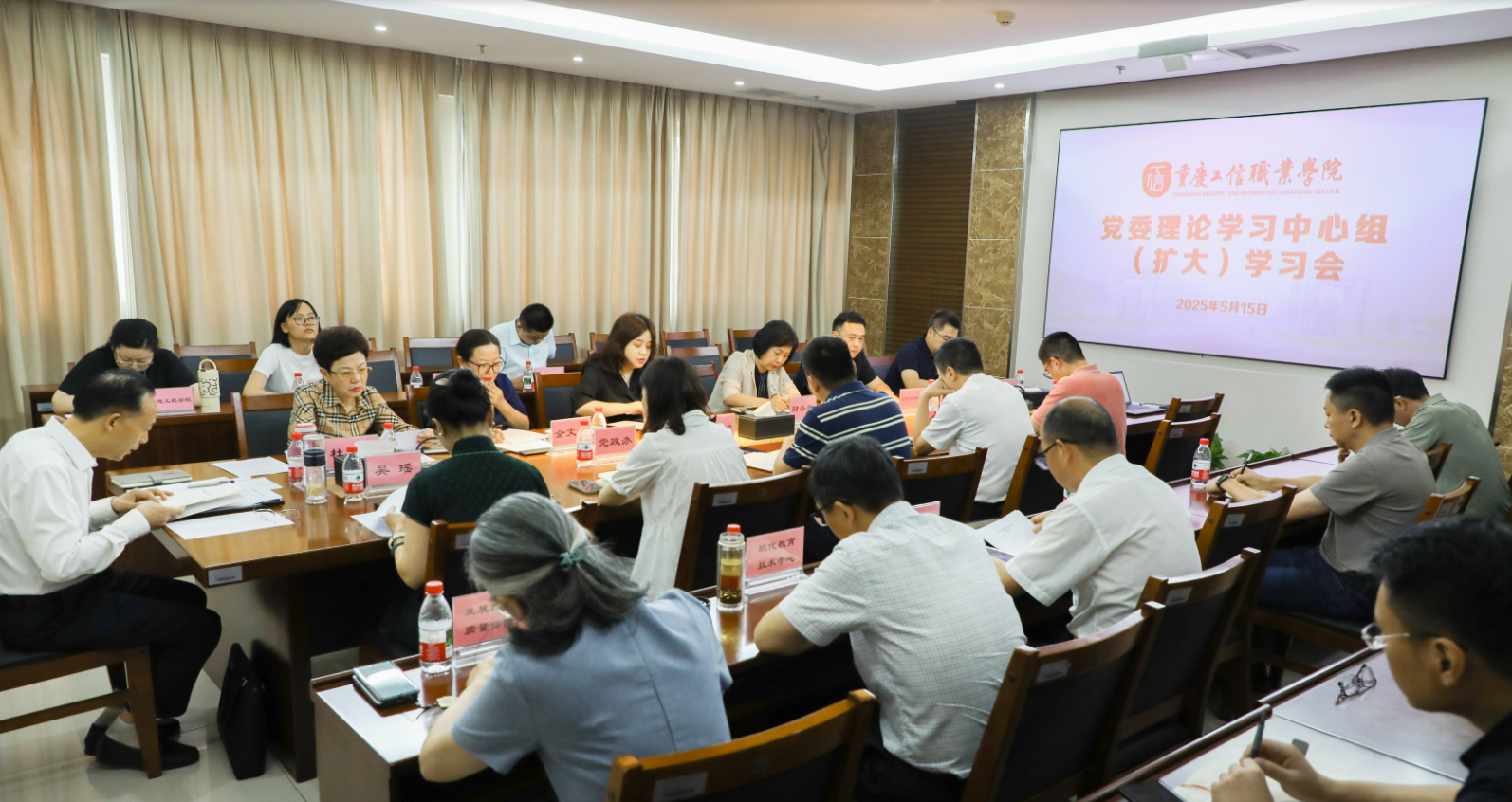 2025年5月15日下午,重庆工信职业学院召开2025年第6次党委理论学习中心组(扩大)学习会。校党委书记高明主持会议并讲话,党委班子成员、各部门及二级学院负责人参加学习。