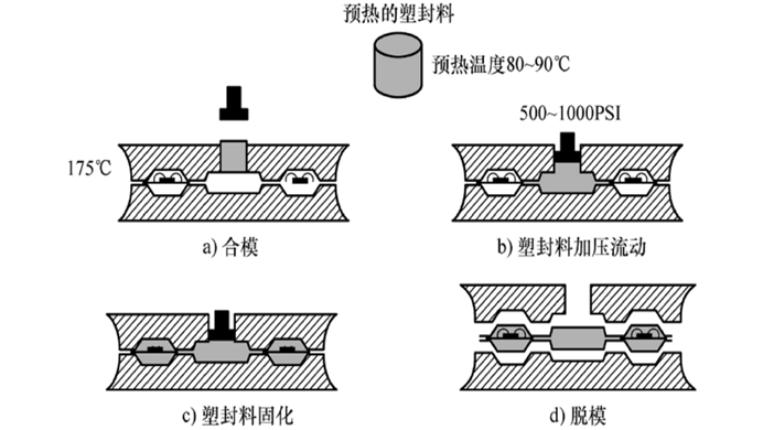 步骤分解:1. 合模:将固晶键合后的组件放入模具;2. 注胶加压流动:塑封机注入环氧树脂;3. 固化:加热使封装材料变硬定型;4. 脱模:取出封装后的组件。