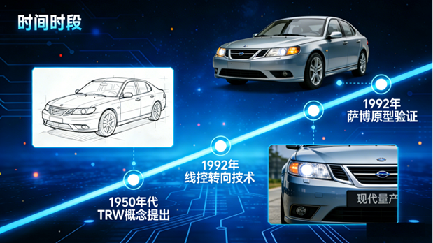 线控转向的由来可追溯至20世纪50年代。美国天合(TRW)集团率先提出用电气信号取代转向盘与转向轮之间机械连接的设想,在试验台里让“电线”转起前轮,却因晶体管还没普及,概念只能长期被锁在实验室的防尘柜里。1992年,萨博在9000车型上试验摇杆式电子转向,把传统方向盘换成飞机操纵杆般的侧置手柄,将手指位移变成数字脉冲,驱动步进电机转动前轮,被视为汽车线控转向的首次原型验证。