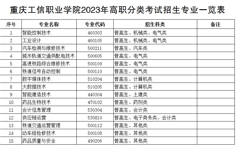 重庆工信职业学院2023年高职分类考试招生专业一览表
