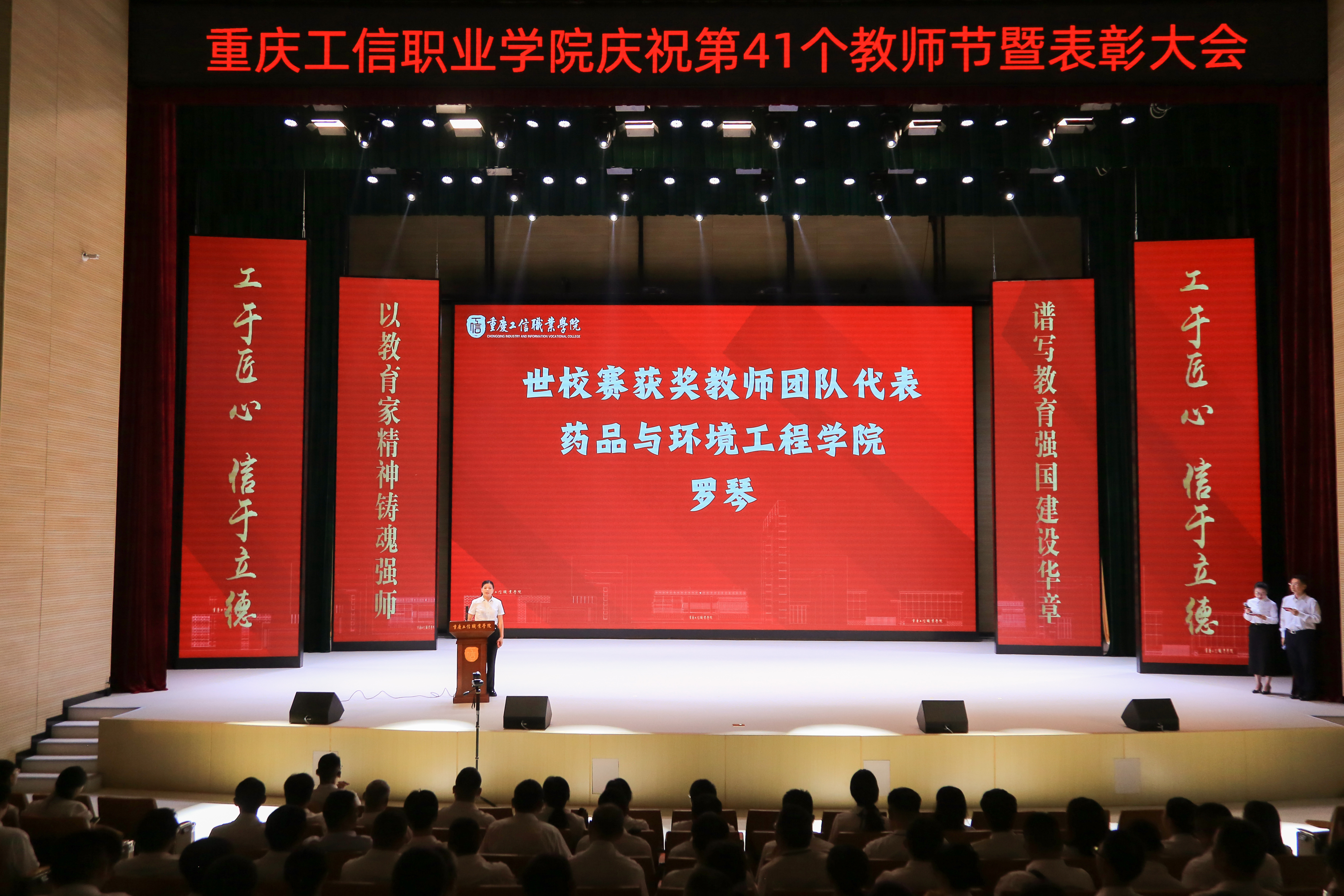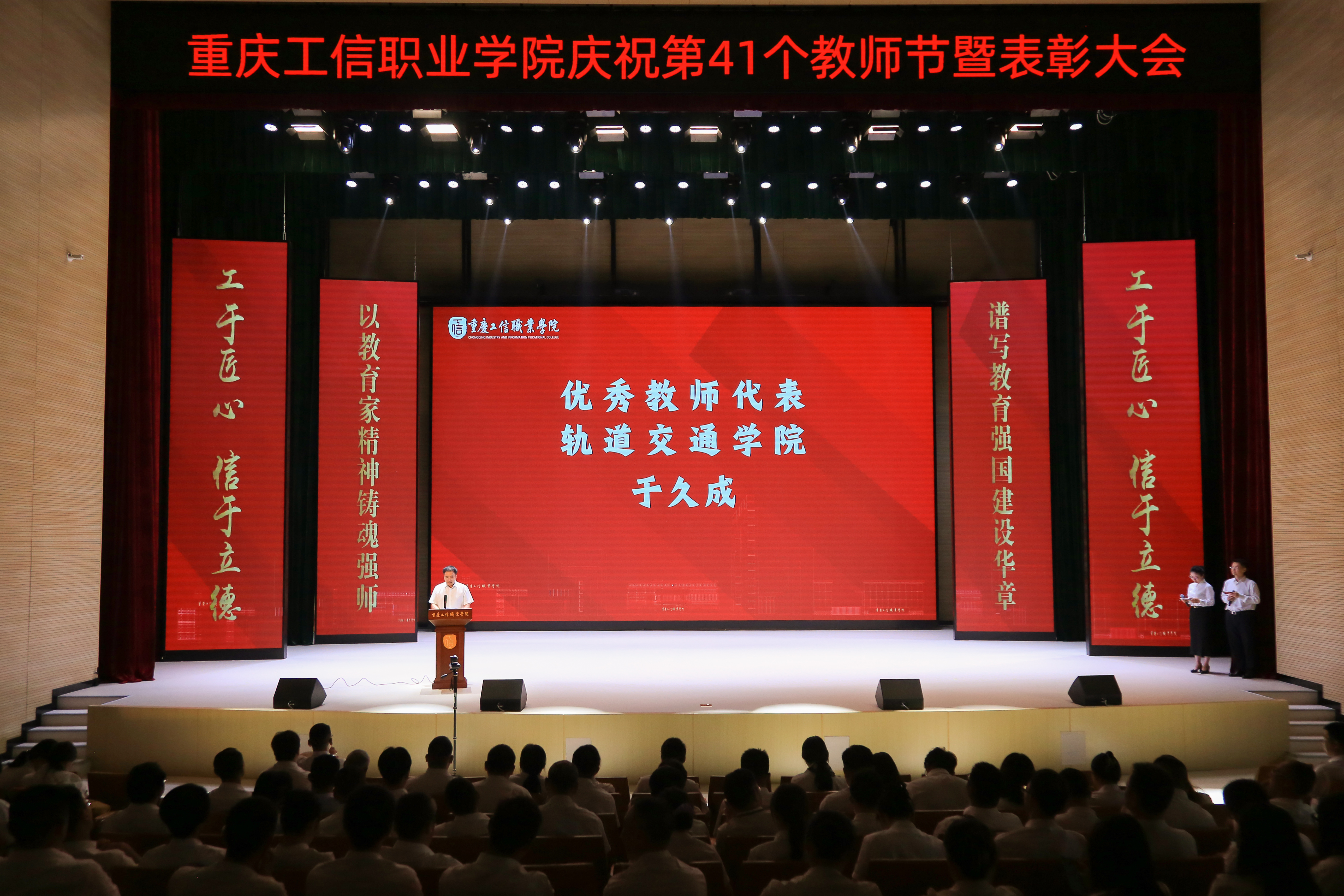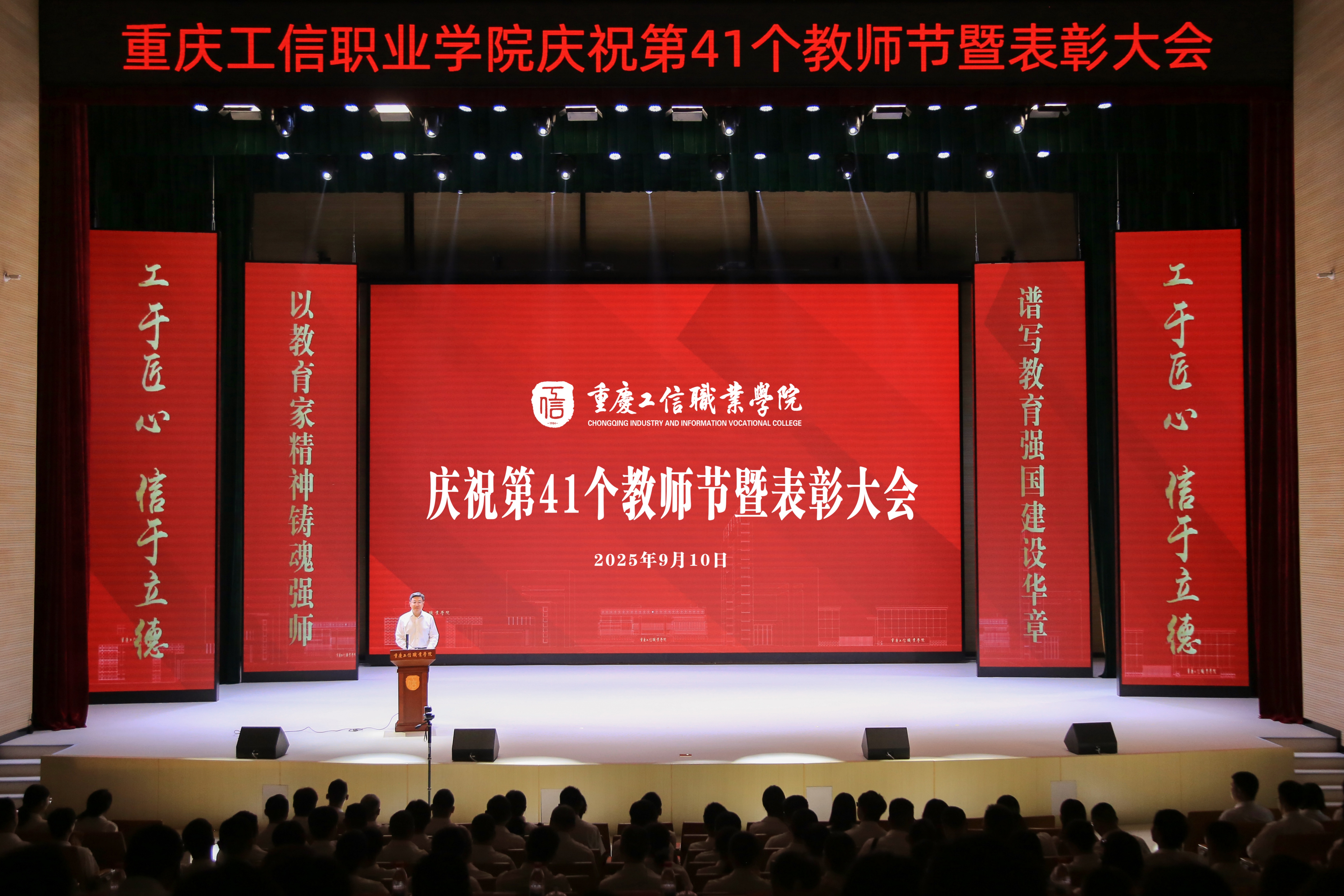 9月10日上午,重庆工信职业学院庆祝第41个教师节暨表彰大会在长寿校区大礼堂隆重举行。市经济信息委党组书记、主任王志杰莅临指导并讲话。长寿区人民政府党组成员、副区长蒋发平,市经信委相关处室领导出席活动。