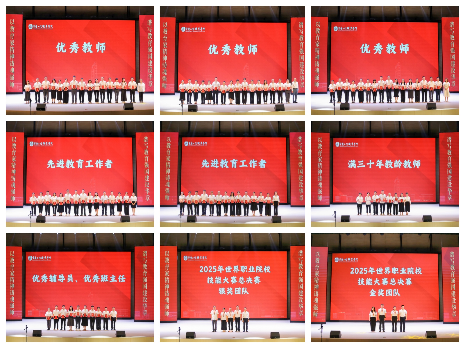 会议对“优秀教师”“先进教育工作者”“优秀辅导员”“优秀班主任”、满“三十年教龄”教师、世界职业院校技能大赛总决赛获奖团队进行了表彰。