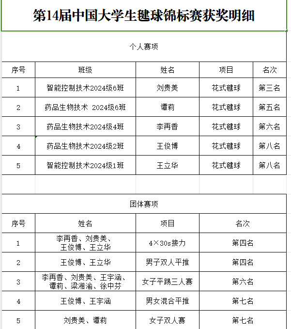 其中,智能控制技术2024级6班的刘贵美同学表现尤为亮眼。比赛中,她凭借扎实的技术功底与稳定的临场发挥,在“花毽个人全能”赛项中脱颖而出,成功摘得铜牌。这枚奖牌意义非凡,不仅是刘贵美个人努力的见证,更实现了我校在国家级毽球赛事中奖牌“零的突破”,为学校体育事业发展写下浓墨重彩的一笔。