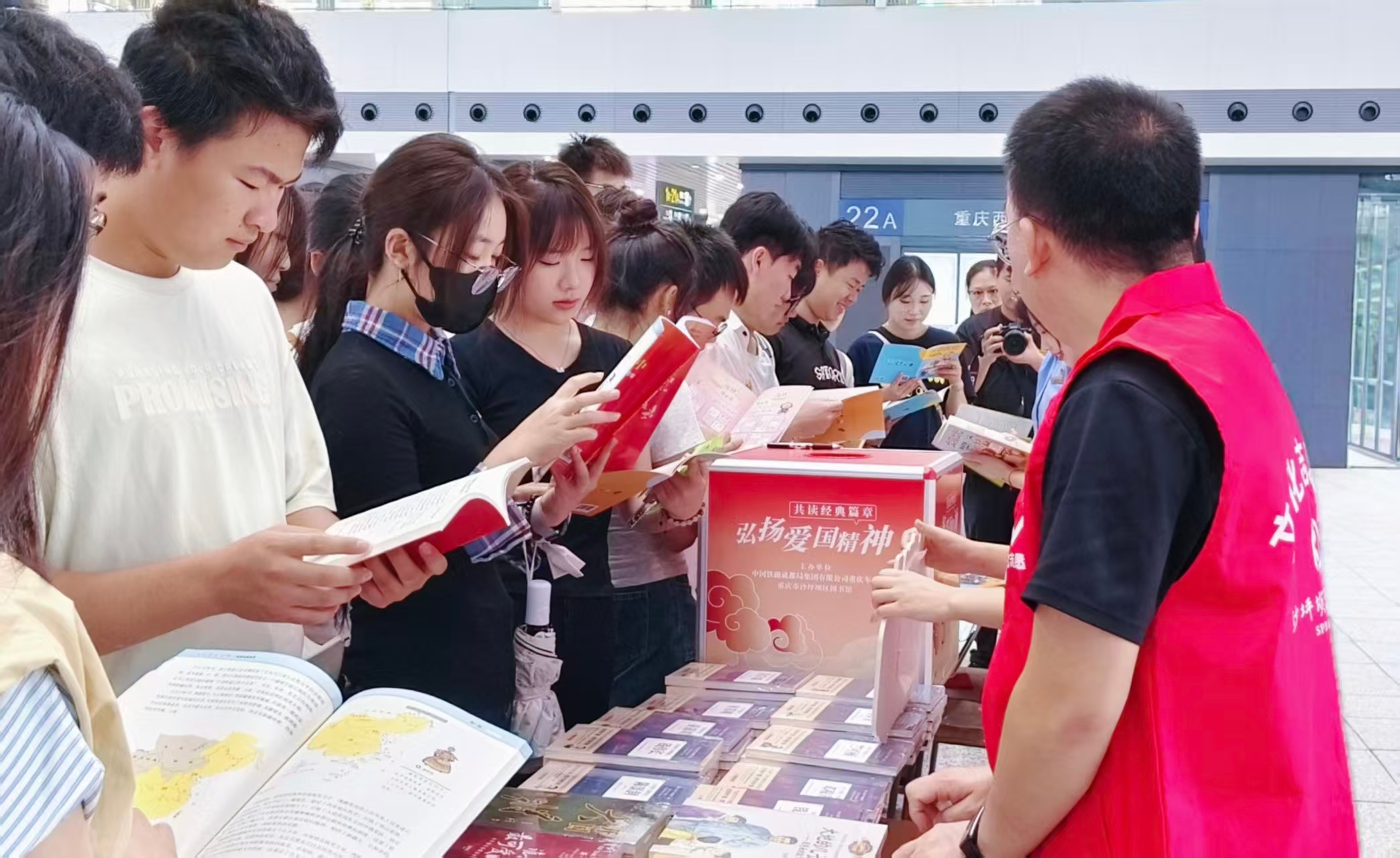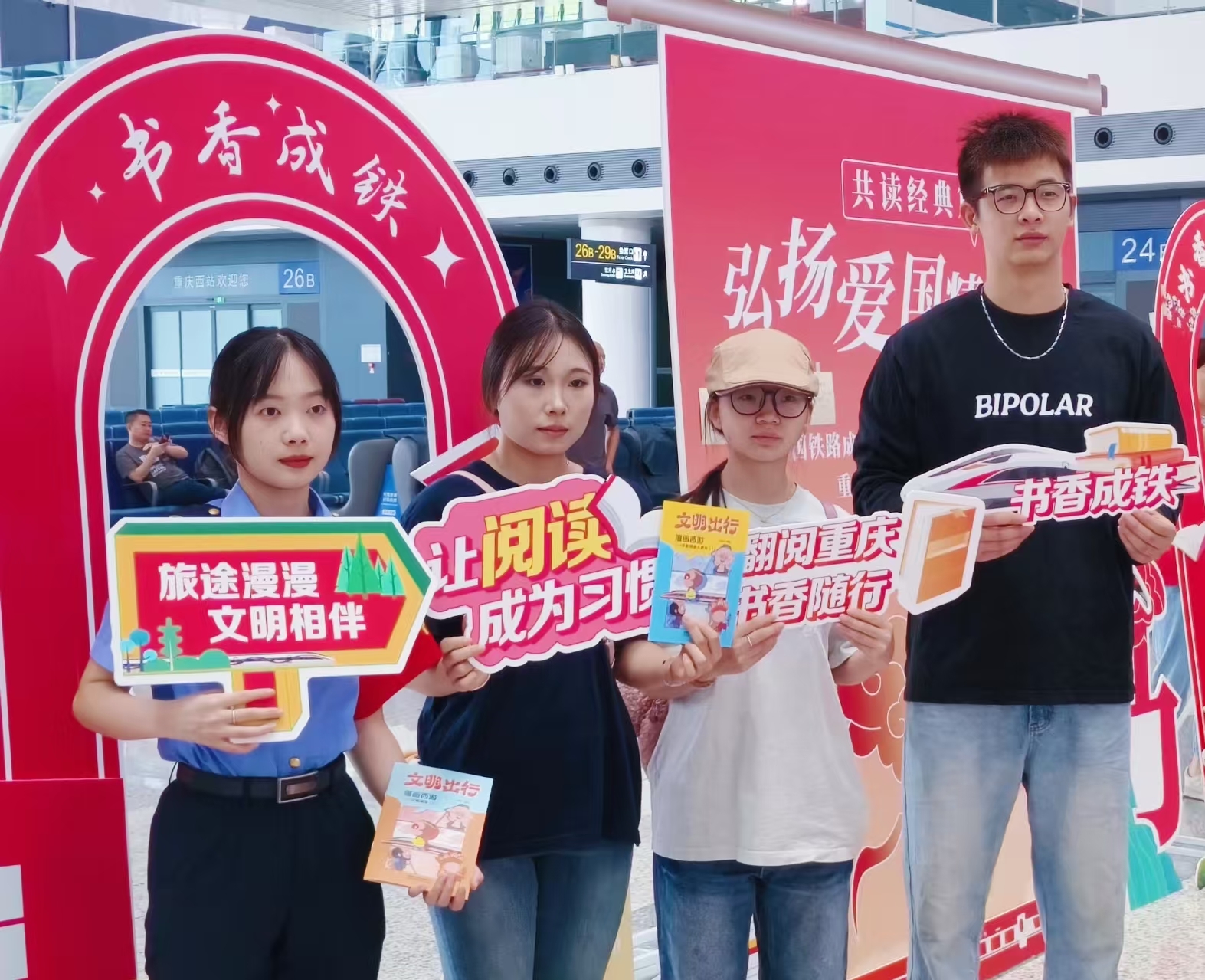 9月29日,“小橙子”们还协助重庆西站举办了“弘扬爱国精神,共读经典篇章”主题文化活动,引导旅客共筑文学墙、传递书香、普及文明出行知识,让匆忙旅途浸润文化暖意,以实际行动展现了工信青年的担当与风采。