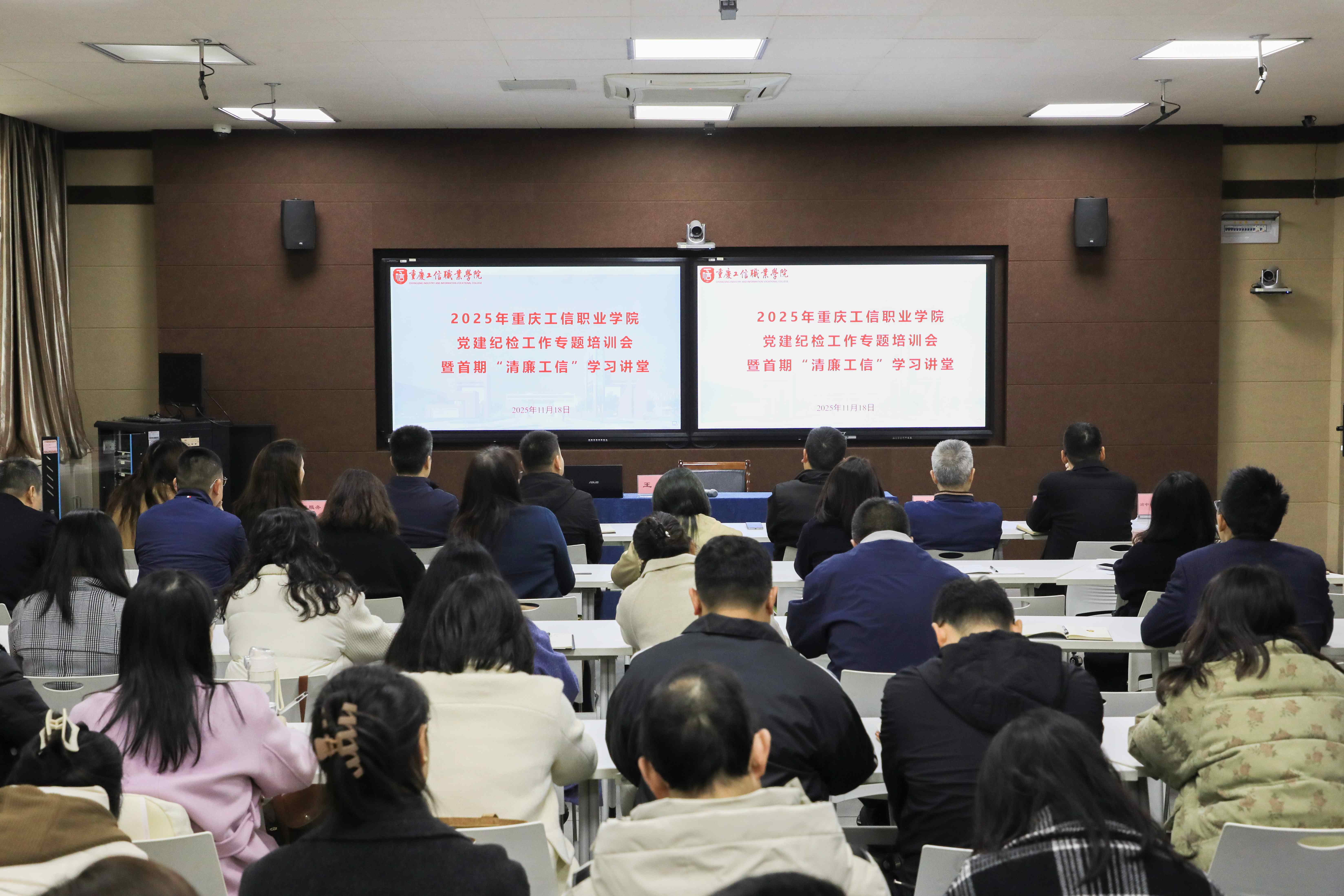 为深入学习贯彻党的二十届四中全会精神,全面提升我校党务、纪检干部的政治素养和业务能力,扎实推进基层党组织建设全面进步、全面过硬,11月17日,学校举办2025年党建纪检工作专题培训会暨首期“清廉工信”学习讲堂。学校纪委委员,二级党组织书记、副书记、委员,各党支部书记、委员及相关党务工作者等共计100余人参加培训。党委委员、党委组织部部长刘正瑜作开班讲话并全程跟班指导。