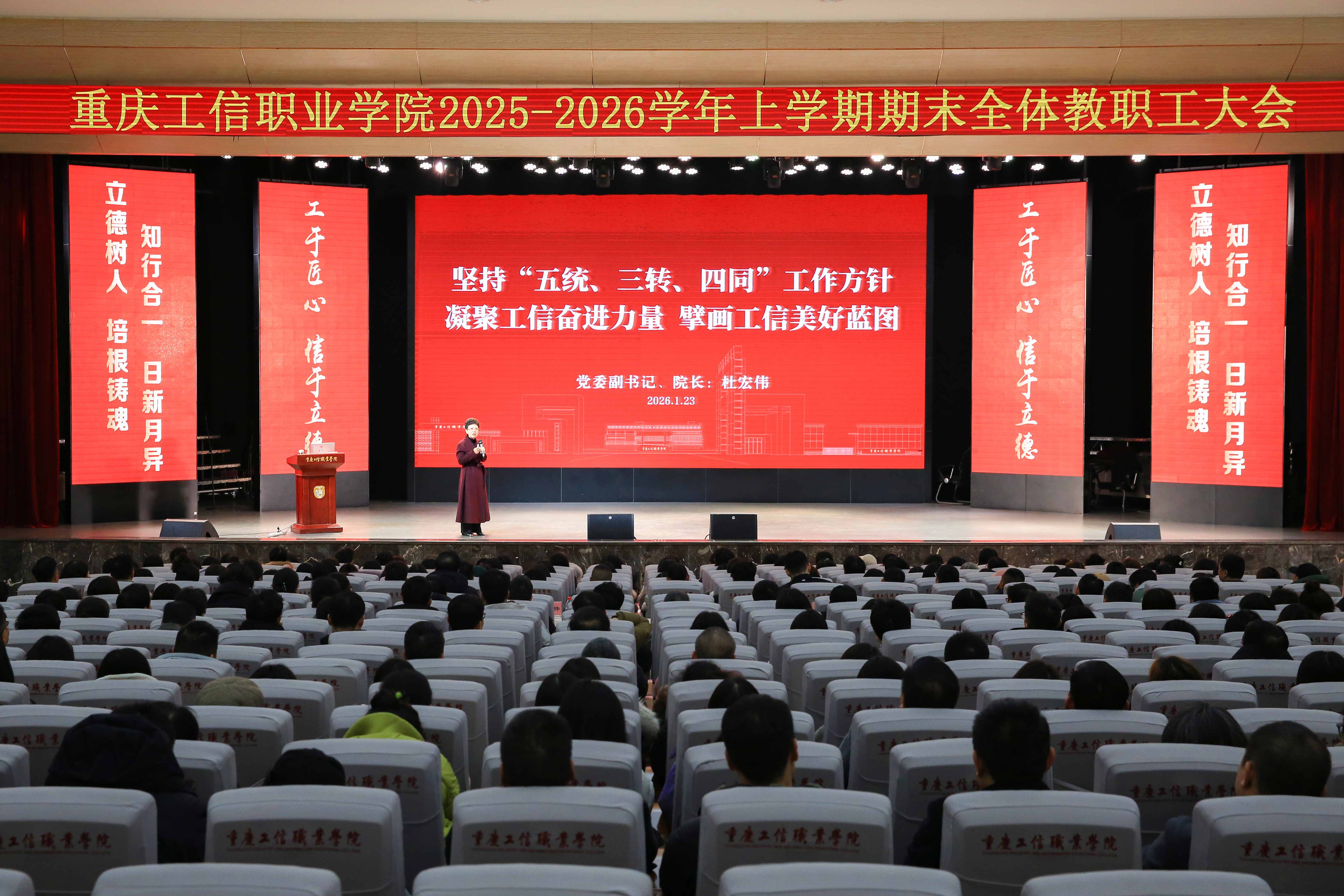 2026年1月23日,重庆工信职业学院在渝中校区召开2025-2026学年上学期期末教职工大会。会议全面总结学校“十四五”时期的办学成果与发展经验,系统分析当前面临的机遇与挑战,擘画“十五五”时期发展蓝图,为建设特色鲜明的高水平职业院校凝聚奋进力量。党委书记高明,党委副书记、院长杜宏伟出席会议并讲话,副院长柴彬堂主持会议,全体校领导及教职工参会。