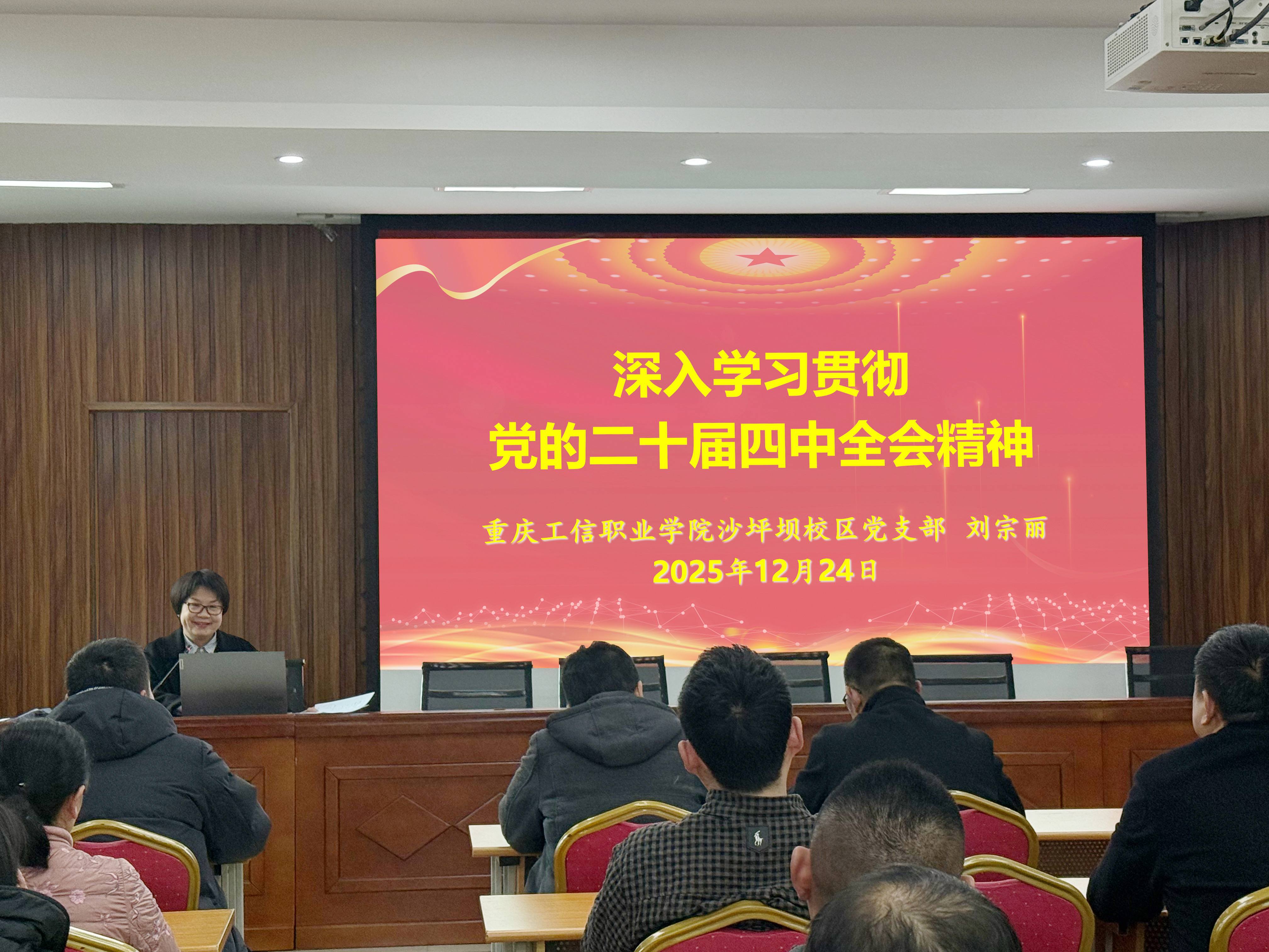12月24日,重庆工信职业学院沙坪坝校区举办学习贯彻党的二十届四中全会精神宣讲报告会。学院宣讲团成员、宣传部部长、沙坪坝校区党支部书记刘宗丽作宣讲报告。会上,刘宗丽围绕学习贯彻习近平总书记在党的二十届四中全会上的重要讲话精神和全会《建议》,从深刻认识党的二十届四中全会的重大意义,准确把握“十五五”时期在基本实现社会主义现代化进程中的重要地位,深刻领会“十五五”时期经济社会发展的指导方针和主要目标